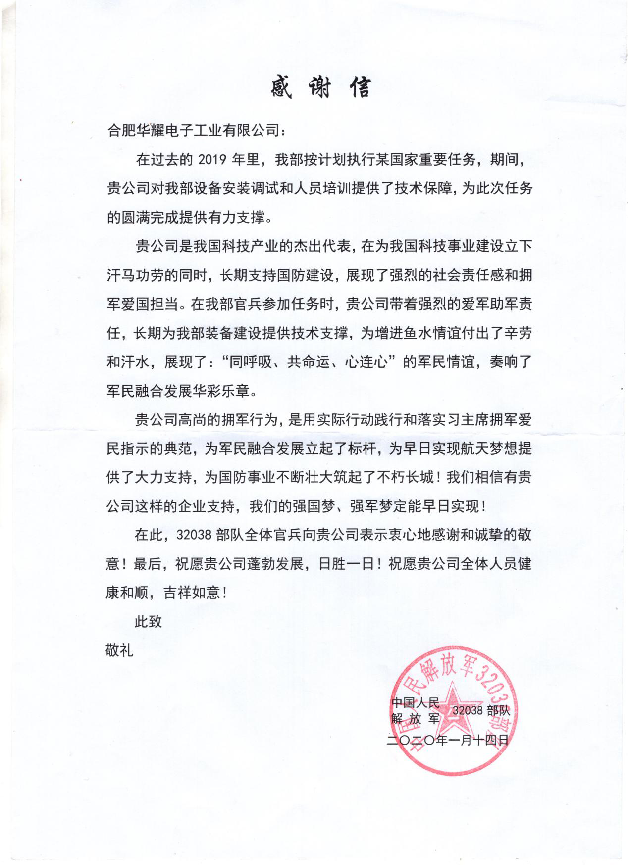 在過去的一年里,02項目組在項目安裝調(diào)試過程中盡職盡責(zé)、不怕苦、不怕累,為國家某重要任務(wù)的圓滿完成提供了有力保障,充分的展現(xiàn)了華耀電源的企業(yè)形象以及在擁軍路上的責(zé)任與擔(dān)當(dāng),正如感謝信中寫到:“貴公司高尚的擁軍行為,是用實際行動踐行和落實習(xí)主席擁軍愛民指示的典范,為軍民融合發(fā)展立起了標(biāo)桿,為早日實現(xiàn)航天夢想提供了大力支持,為國防事業(yè)不斷壯大筑起了不朽長城!我們相信有貴公司這樣的企業(yè)支持,我們的強國夢、強軍夢定能早日實現(xiàn)”。
