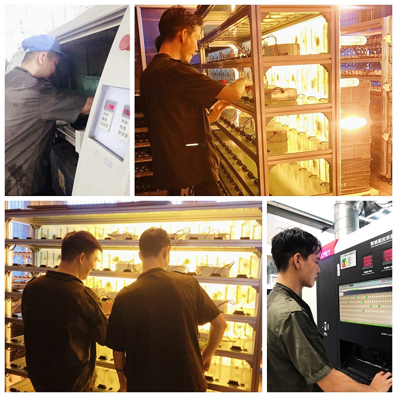 天智路廠區(qū)老化實驗室里,老化設備正在轟隆隆運轉(zhuǎn),給原本就炎熱的天氣又強加了一層炙烤的氣息。負責老化工序的員工似乎已經(jīng)習慣了這種溫度,正在給富樺明的某系列產(chǎn)品上架老化,濕透的工作服緊緊黏在身上。這種產(chǎn)品老化上架,生產(chǎn)一部幾乎每天都需要安排三至四人負責,他們需要在比外面更酷熱難耐的老化實驗室里工作一個半小時左右,確保需老化的產(chǎn)品順利上架進行老化。