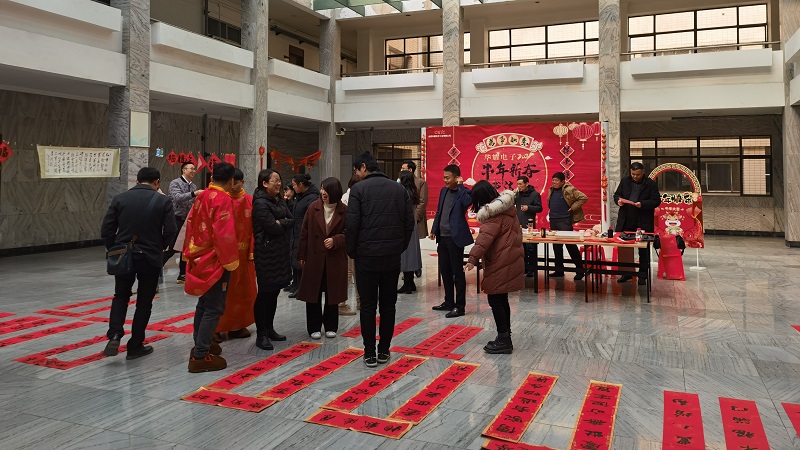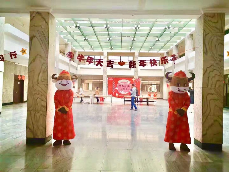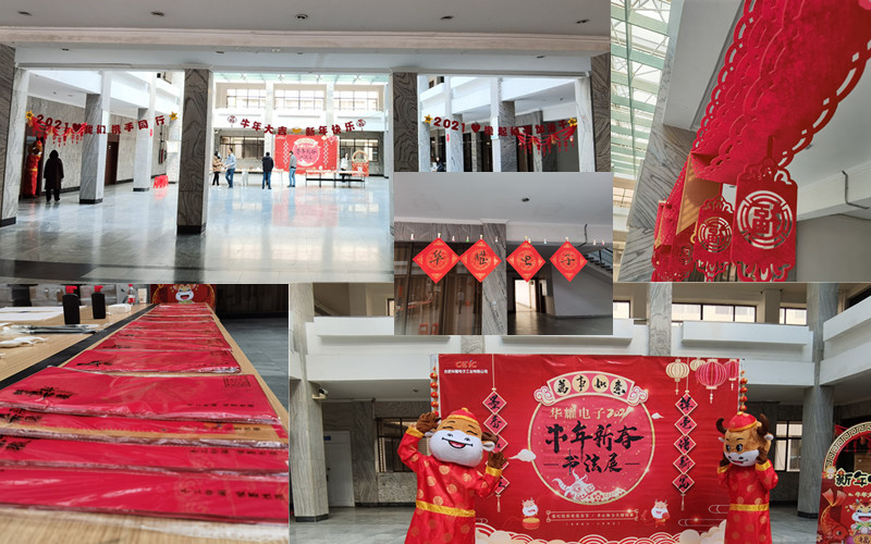 2021年2月2日正午,淠河路所區101大樓空曠的一樓大廳內“披上紅妝”,可愛的牛娃、福娃“空降現場”,三張寬大的書案上,整齊地擺放著筆墨紙硯?;鸺t的燈籠,喜慶的對聯,歡快的音樂,這一派紅紅火火的年味,是在告訴華耀員工,大家期盼已久的牛年新春書法展開幕啦!