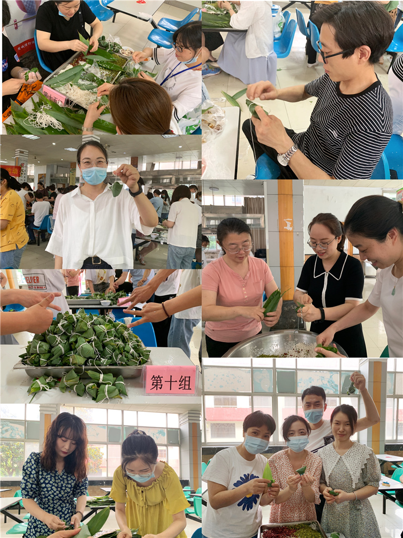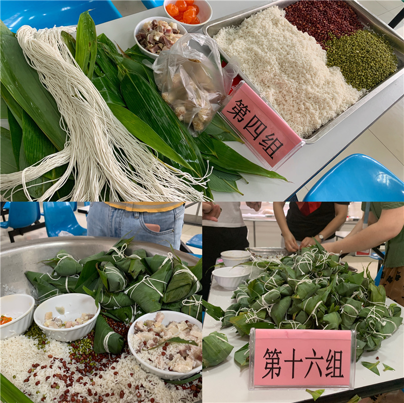 你拿粽葉我添米、你放餡來我纏線,雖是一場比賽,各組之間共同協作、互幫互助。還沒到半小時,準備的粽葉就全部包完,質量和速度較以往兩屆大幅提升。包好的粽子扁圓尖細、形態各異,有嬌小玲瓏型,有富態滾胖型,但相同的都是披上了“綠色、吉祥、歡樂”的外衣,整個上午,食堂里洋溢著濃濃的節日氣息,歡聲笑語不斷。