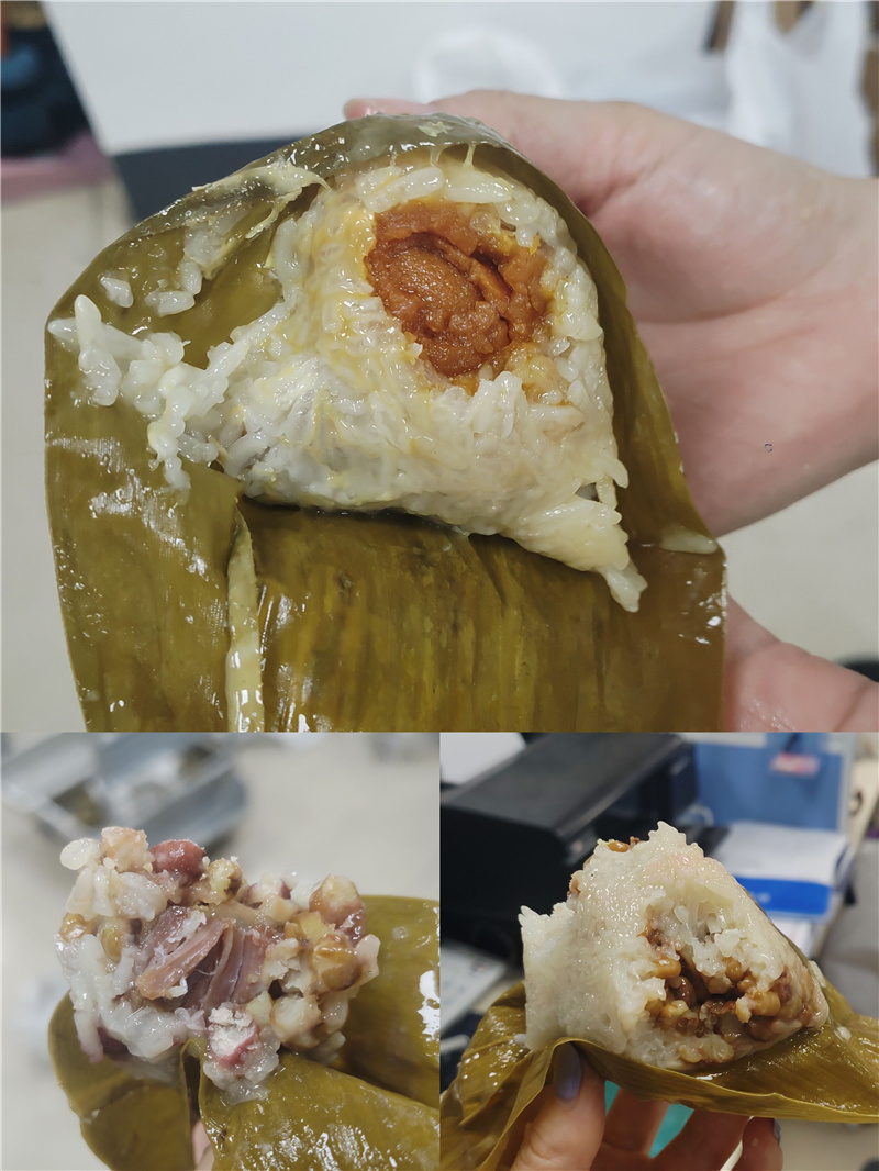 在大家共同努力下,上千個形態各異的粽子熱氣騰騰地出爐了,空氣中散發著清爽甘醇的氣息,粽葉的香氣和各種食材加熱后的甜香咸味彌漫在生產辦公區。