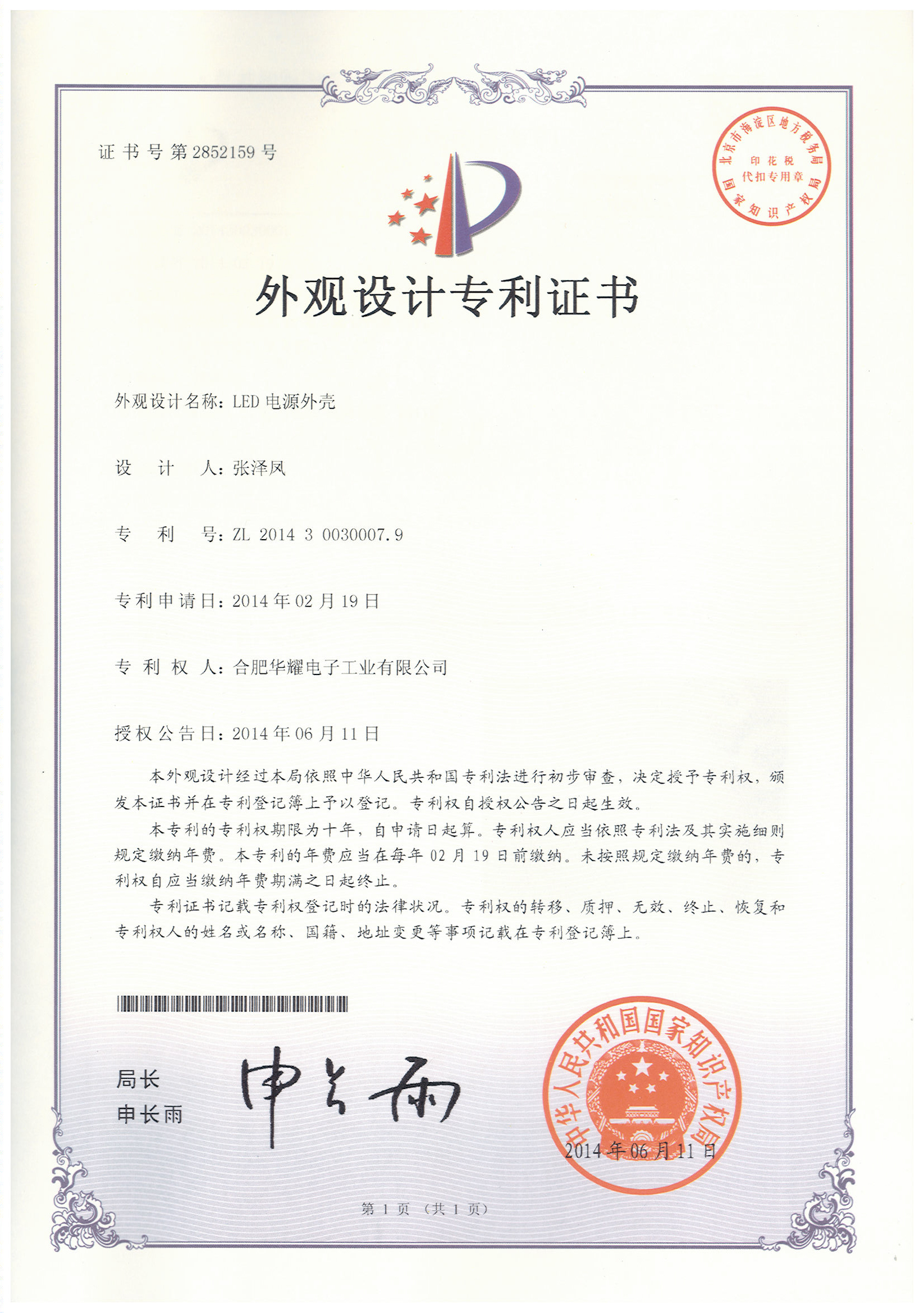 外觀設(shè)計專利證書